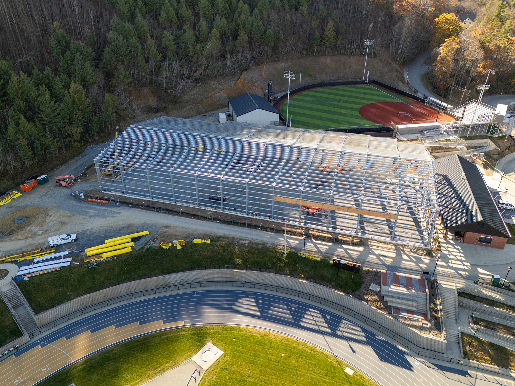 The structural steel frame for the new indoor tennis facility at App State's Appalachian 105 Sports Complex in Boone is shown at center in this aerial image, taken Nov. 5, 2025. The facility is slated for completion in February 2026. Click on the image for a full view. Photo by Wes Craig and Troy Tuttle