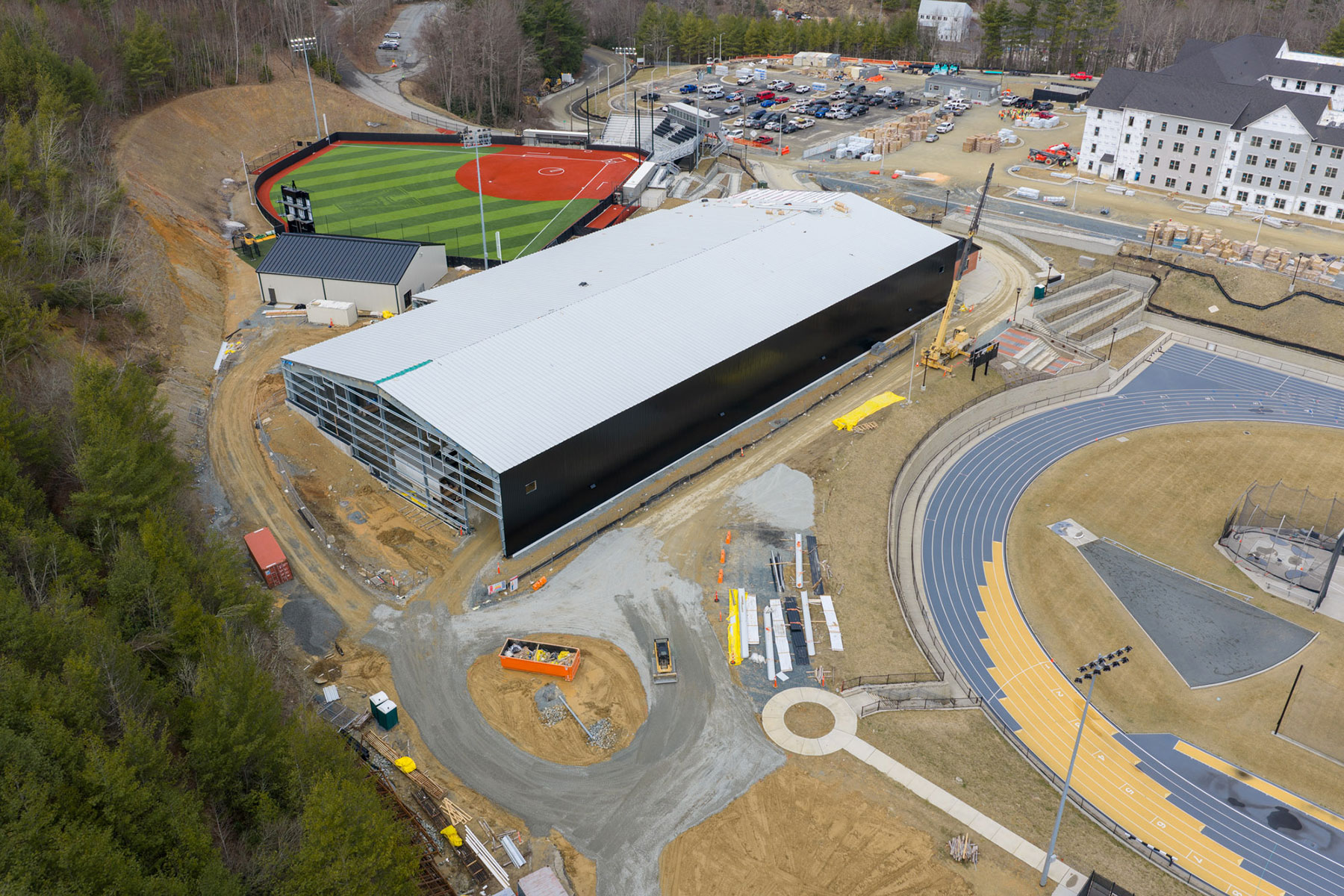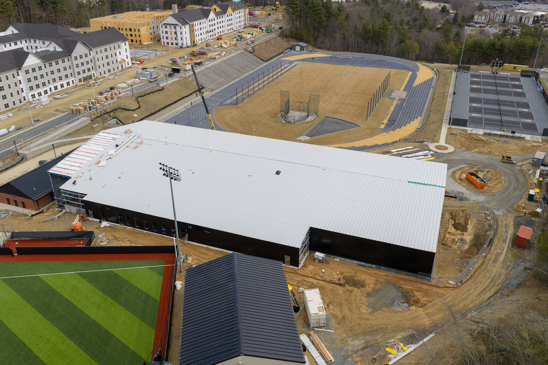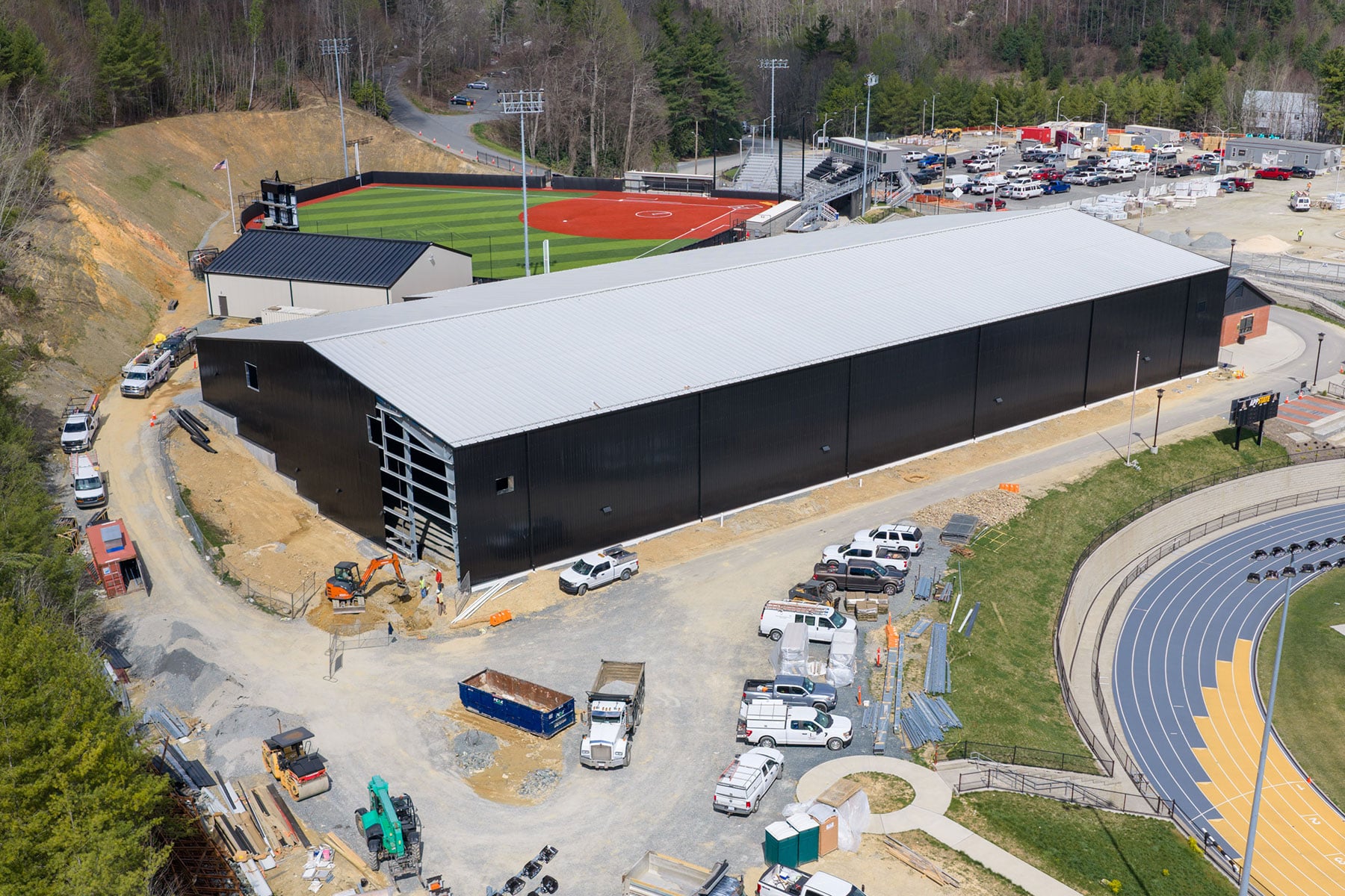 Construction work continues on schedule for the new indoor tennis facility at App State's Appalachian 105 Sports Complex in Boone, as shown in this aerial image, taken March 3, 2026. Click on the image for a full view. Photo by Wes Craig and Troy Tuttle