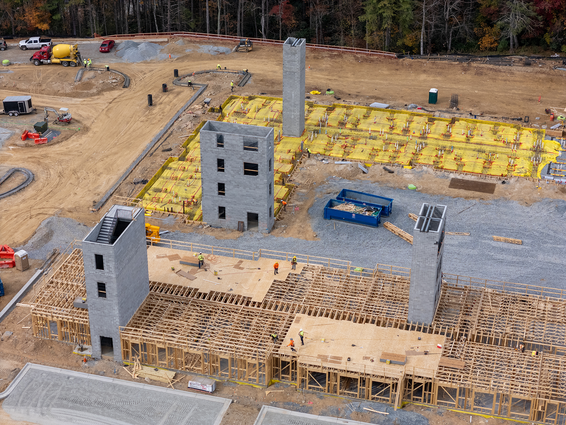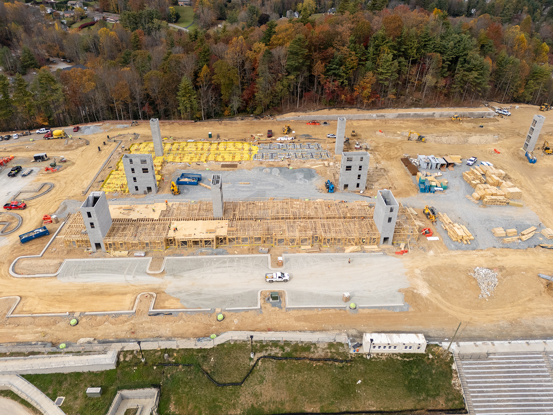Site preparation for the construction of the project began in May 2025, and construction is expected to be completed by fall 2027. Site demolition and erosion control were completed in summer 2025 and the project is approximately 15% complete, as of October 2025. Underground utilities installation at the site is ongoing, and workers are constructing the buildings’ stair towers. Additionally, framing has begun for one of the Mountaineer Ridge buildings and workers are preparing to pour the concrete slab for a second building in the complex.