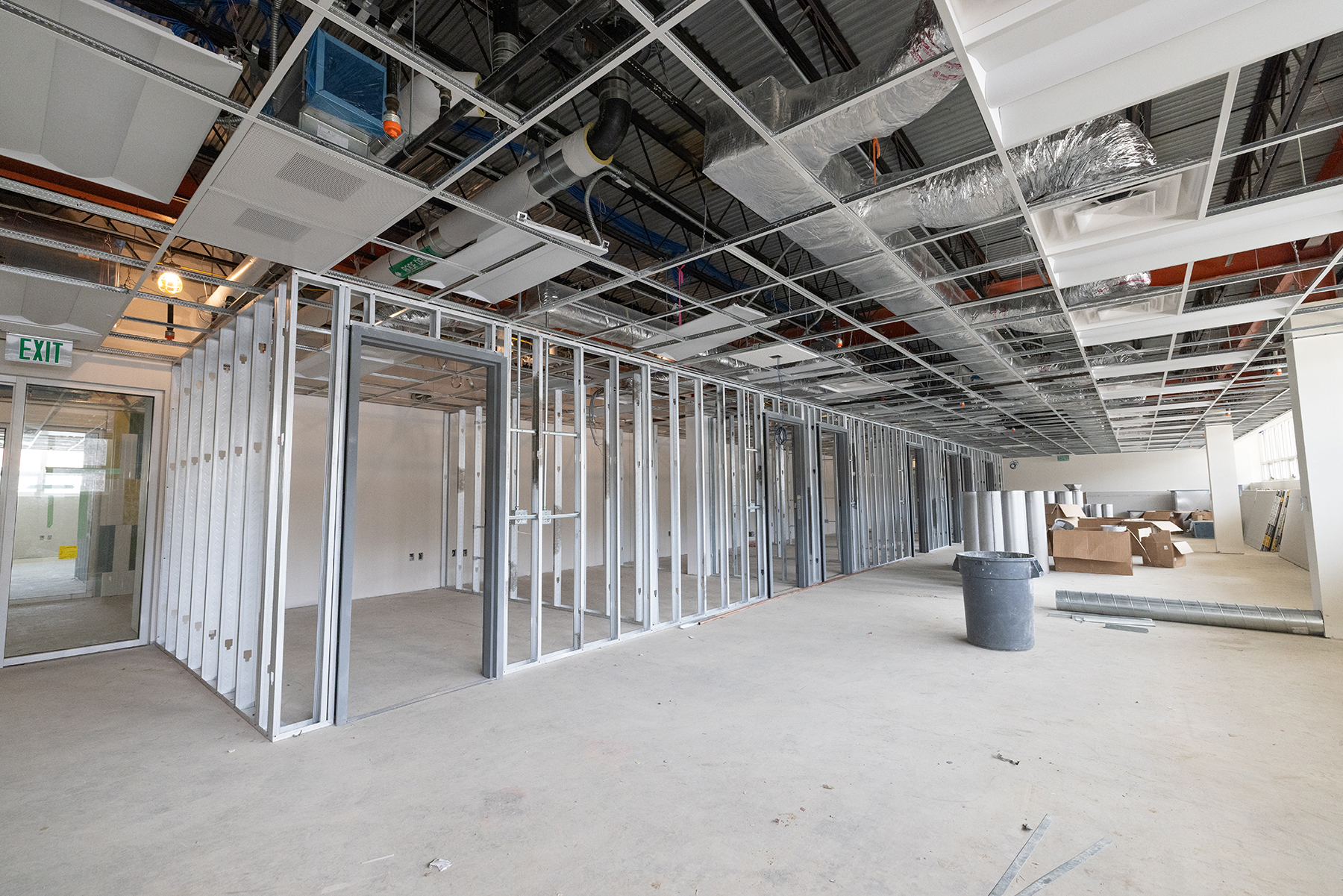 Ongoing construction work for the project includes plumbing, piping and duct work and electrical rough-ins, along with interior painting, drywall application and doors installation. Additionally, various sidewalks and curbing have been poured. Edwin Duncan Hall’s main entrance has been shifted to the northwest end of the building, near the adjacent Peacock Parking Lot.