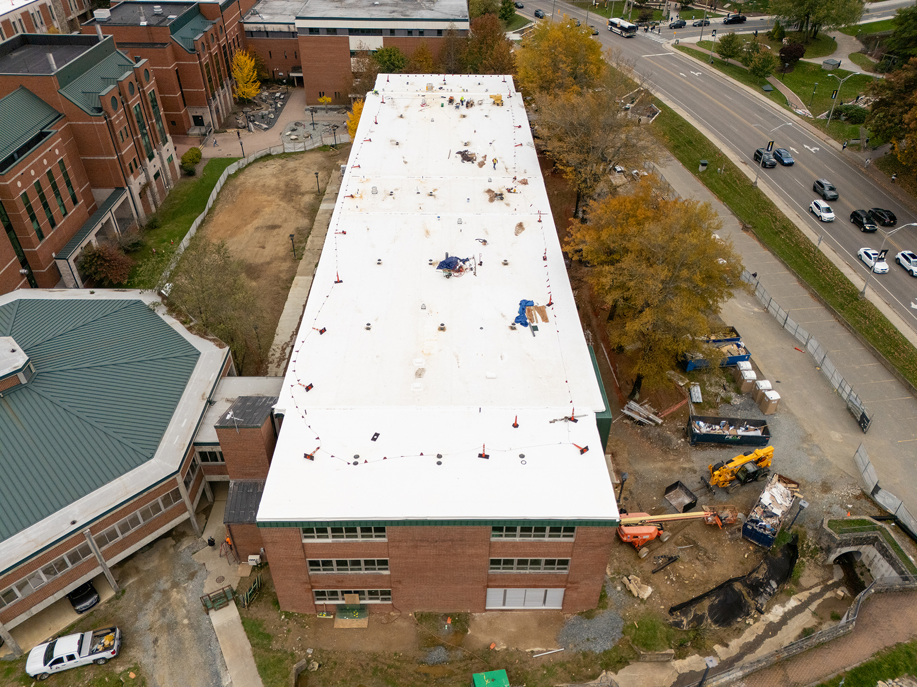 Recent construction work for the project includes plumbing, piping and duct work, along with electrical rough-ins, and interior painting on the second and third floors. The installation of interior glass is nearing completion and the installation of metal roofing trim is ongoing. Edwin Duncan Hall’s main entrance has been shifted to the northwest end of the building, near the adjacent Peacock Parking Lot.