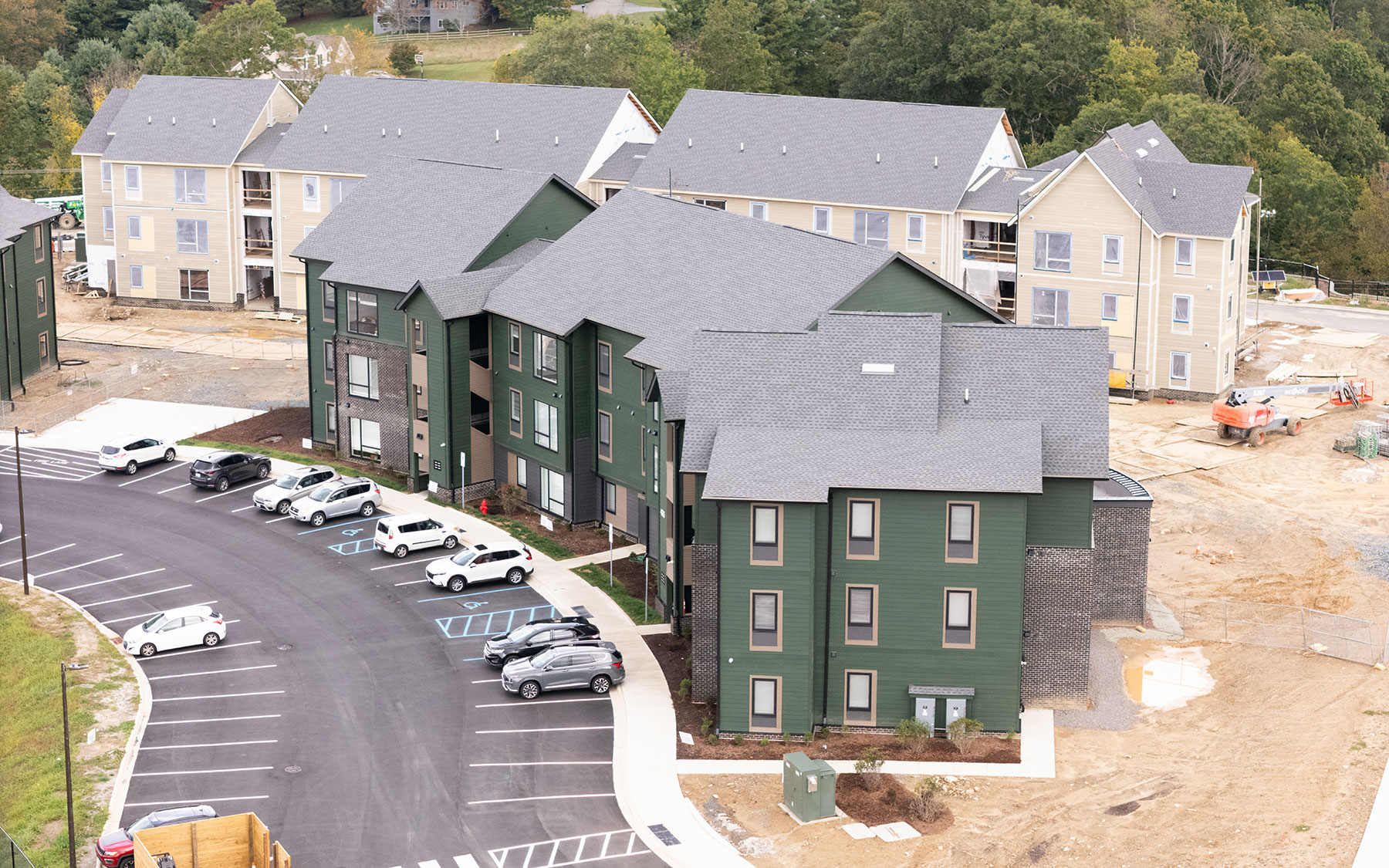 This aerial image, taken Sept. 2, 2025, shows the Innovation Ridge faculty and staff housing project at App State’s Innovation District. The first Innovation Ridge building, shown at right in the foreground, opened to residents on Aug. 16, 2025, and construction is nearing completion for the second Innovation Ridge building, shown at left in the foreground. Innovation Ridge, once completed, will consist of five multistory buildings housing 156 faculty and staff units that offer one-, two- and three-bedroom configurations. Photo by Wes Craig and Troy Tuttle