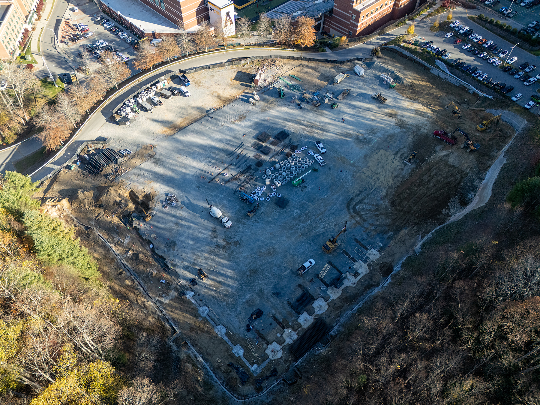 Demolition of the previous indoor practice facility was completed in summer 2025, and construction work for the new facility is underway. The project is more than 25% completed, as of November 2025, and construction work continues for the site’s retaining wall system. Additionally, workers have begun installing stormwater infrastructure at the site, and work for the facility’s foundation is at the halfway mark. Construction is expected to be completed in September 2026, and a groundbreaking ceremony for the new facility took place Aug. 15, 2025.