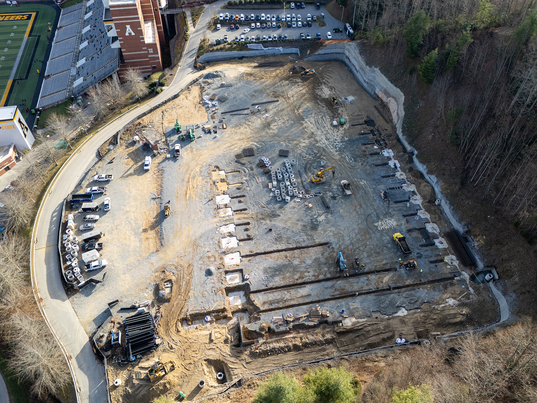 Demolition of the previous indoor practice facility was completed in summer 2025, and construction work for the new facility is underway. The project is more than 25% completed, as of November 2025, and construction work continues for the site’s retaining wall system. Additionally, workers have begun installing stormwater infrastructure at the site, and work for the facility’s foundation is approximately 75% complete, as of December 2025. Construction is expected to be completed in September 2026, and a groundbreaking ceremony for the new facility took place Aug. 15, 2025.