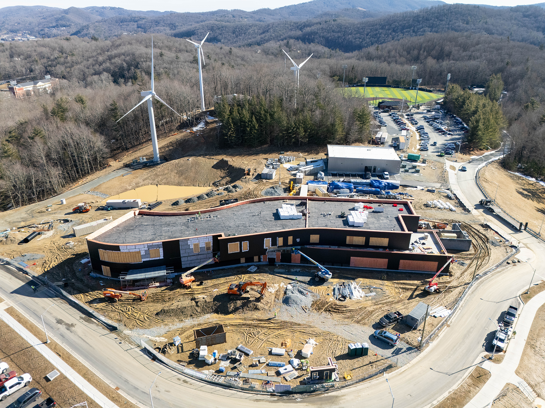 Construction work for the STEM Academic Building at App State's Innovation District is more than 40% finished, as of February 2026. Around 90% of the facility’s exterior sheathing is in place, as shown in this aerial image, taken Feb. 11, 2026, and workers are applying the facility's roof. Click on the image for a full view. Photo by Wes Craig and Troy Tuttle